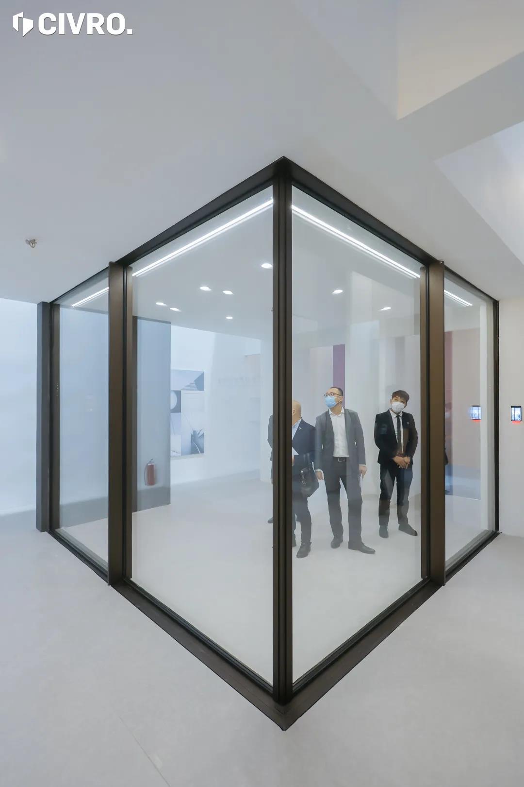 与传统门窗存在形式截然不同,打破常规的门窗存在状态被CIVRO焕新解码。窄至极限但性能丝毫不妥协的无障碍通行推拉门,商用级别人脸识别功能的智能锁闭系统,转角无立柱全视野落地窗,通风换气自循环隐藏式电机电动“悬浮屏”平推窗系统,极具极简风格的金属与玻璃材质的全功能智能铝板门,全埋式100%玻璃无框护栏,“Tooth-hook”(勾齿链)专利工艺加持的灵动护墙装饰系统,结合现代技术标志——电动化、智能化,与展厅外围矩阵式结构对比,产生强烈“立与破”颠覆体验,在固定的掣肘中,呈现鲜明有力的突破价值。
